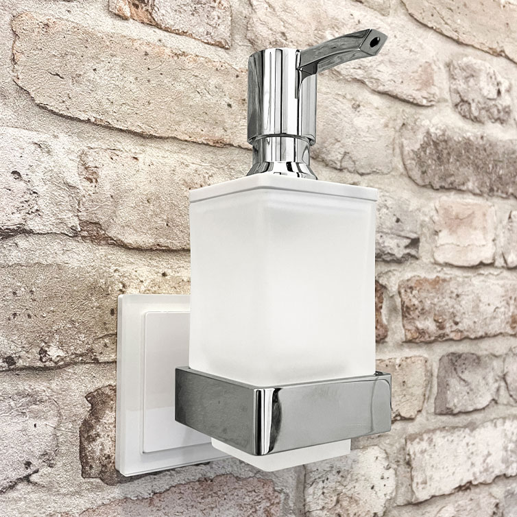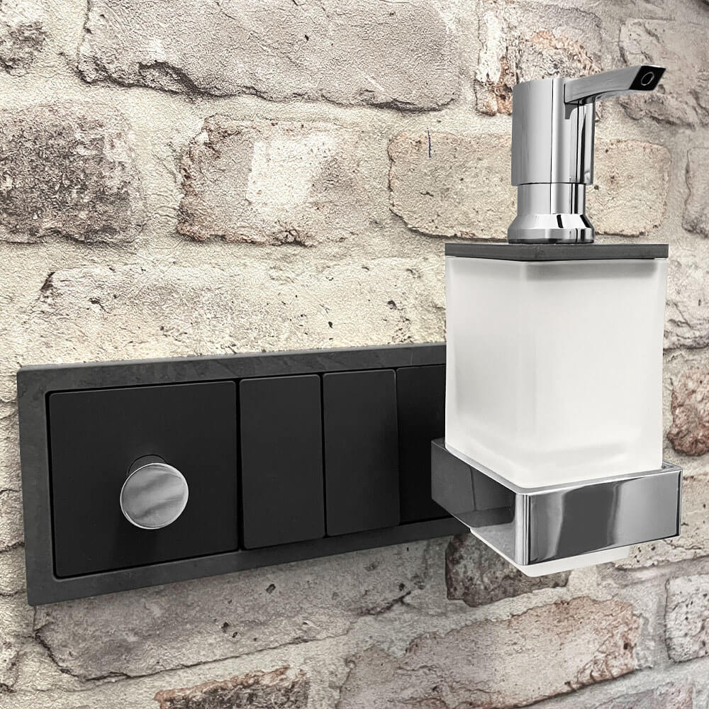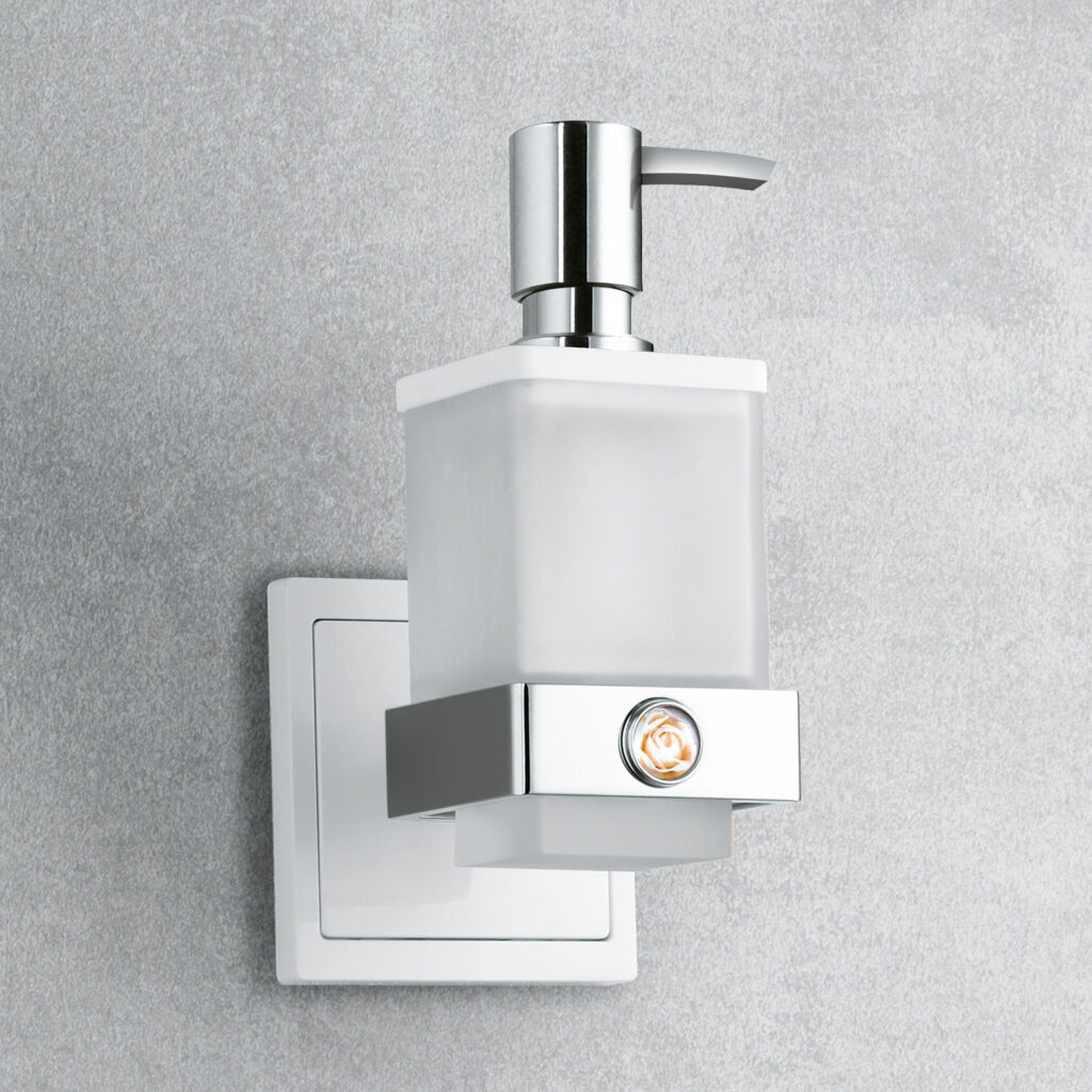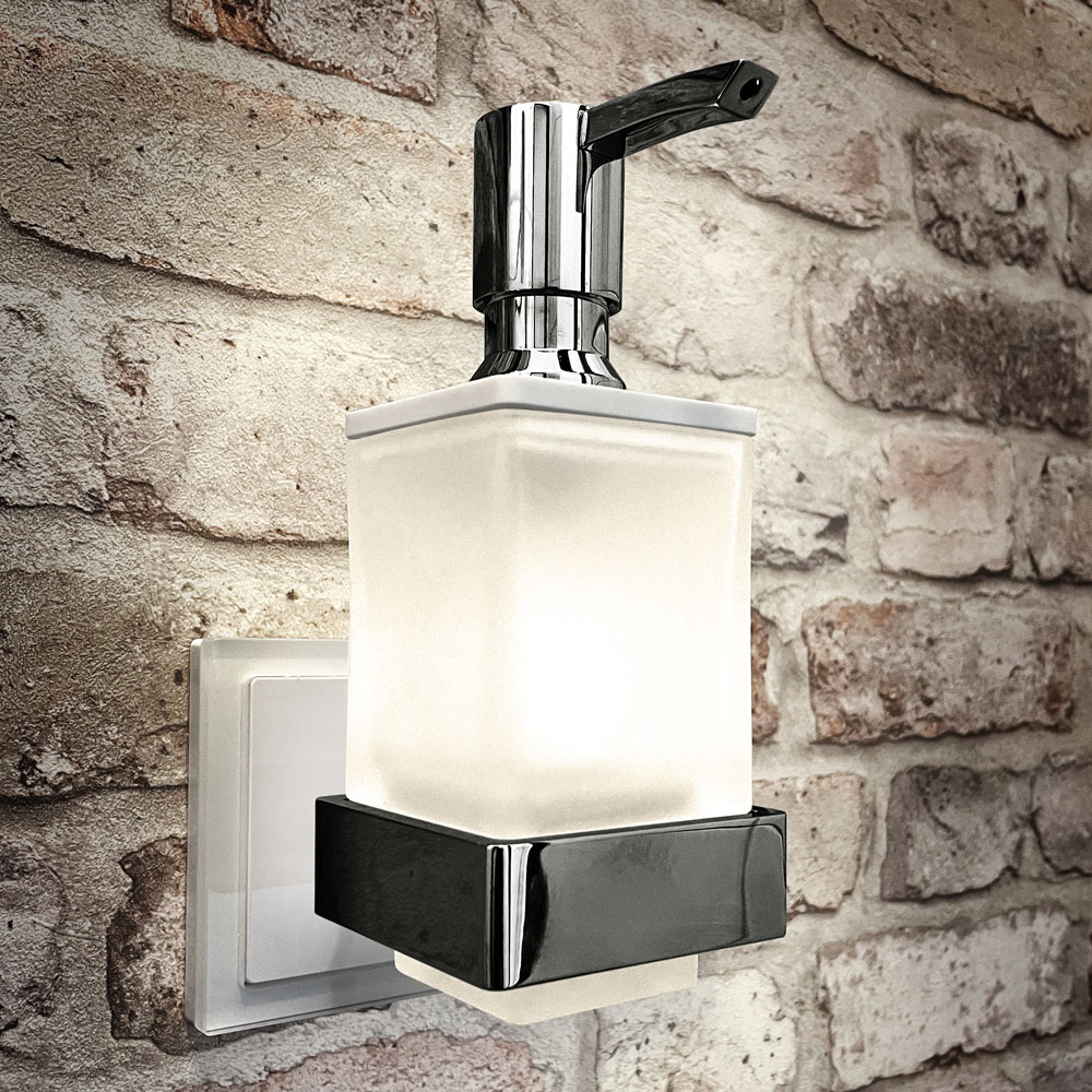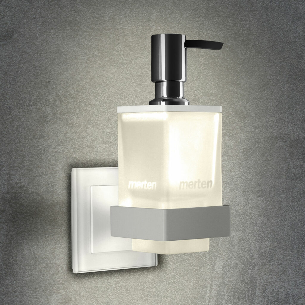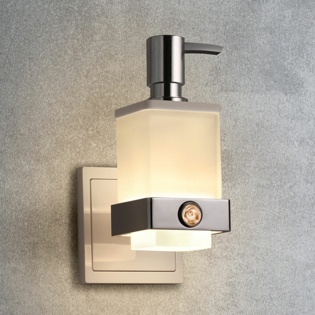 - Lieferumfang: qles Badhalter Lotionspender, Glas satiniert, Pumper, Deckel, Flex-Base, Busch LED Technik Spannungsversorgung