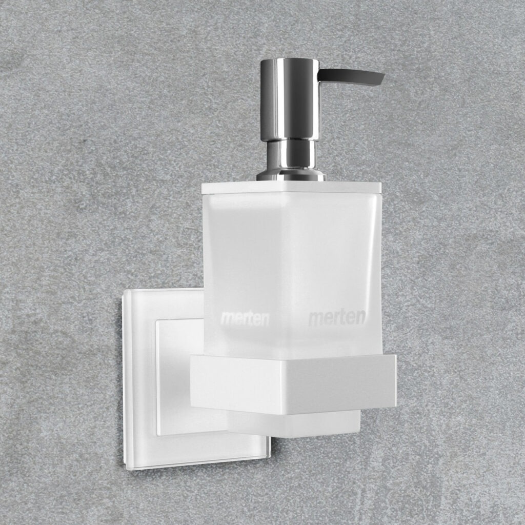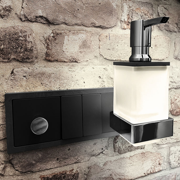 Die Farbe des Badhalters und den Deckel des Lotionspenders stimmen Sie einfach auf Ihr Merten Schalterprogramm ab. Als zusätzlichen Hingucker ergänzen Sie den Badhalter mit einem qles Click. Diese Schmuckdruckknöpfe erhalten Sie in vielen Designs oder als Wunschanfertigung, z. B. mit einem Logo.