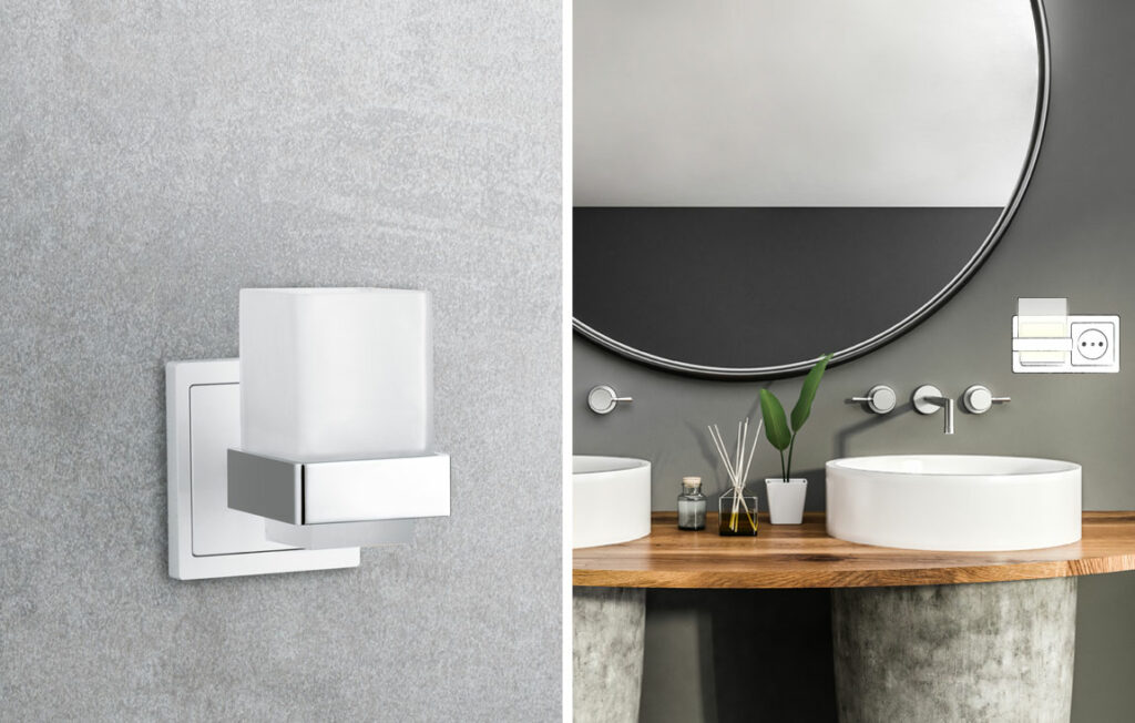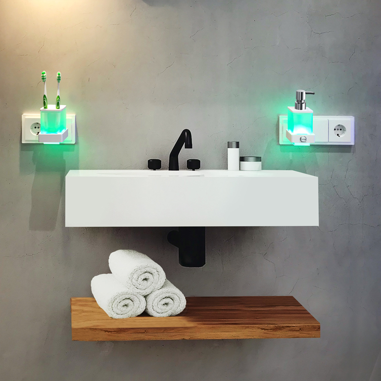 Das Bad gilt heute als wichtiges Kriterium eines gelungenen Wohndesigns: in privaten Räumen ebenso wie in der Objekteinrichtung, z. B. im Hotel. Mit dem qles Badhalter Wasserglas fügen Sie dieses praktische Accessoire symbiotisch in Ihr Designkonzept ein. Die Halterung korrespondiert in der Linienführung hervorragend mit dem Badhalter Lotionspender und der qles Wandlampe. Besonders reizvoll ist die beleuchtete Ausführung der Halterung. Sie sorgt für einen echten Wow-Effekt im Bad.