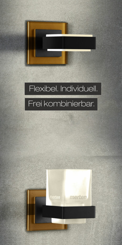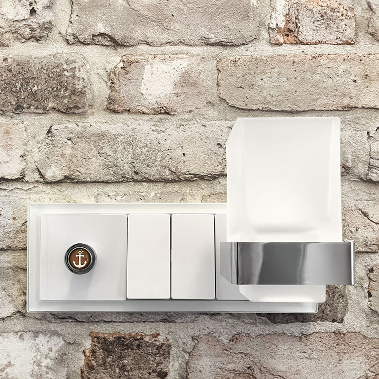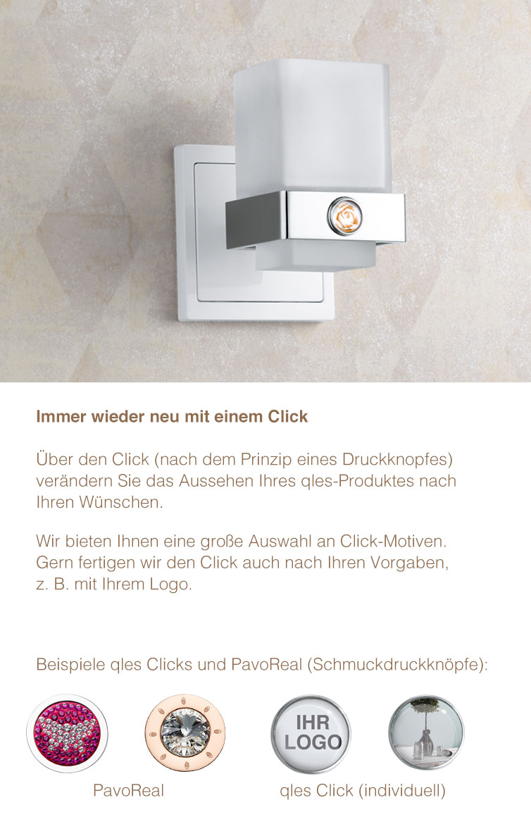Die Farbe der Glas-Halterung stimmen Sie einfach auf Ihr Merten Schalterprogramm ab. Als zusätzlichen Hingucker ergänzen Sie den Halter mit einem qles Click. Diese Schmuckdruckknöpfe erhalten Sie in viele Designs oder als Wunschanfertigung, z. B. mit einem Logo.