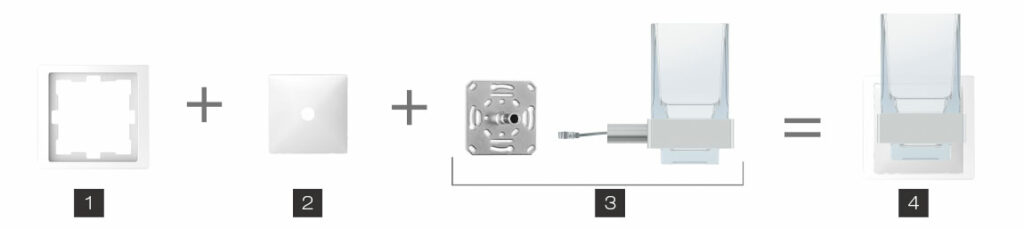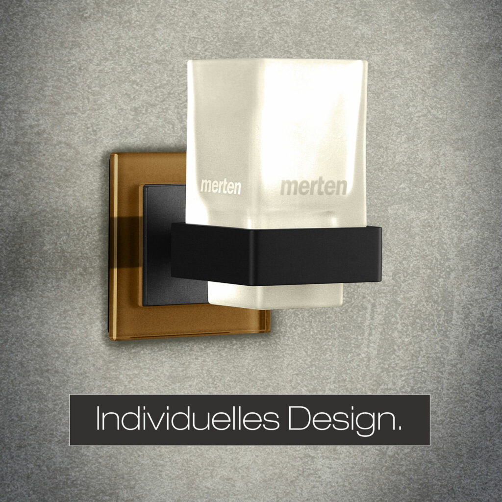 1 Merten Rahmenprogramm D-Life oder System M, 2 qles Abdeckplatten Flex-Base in den Farben der Merten D-Life und System M Rahmenprogramme, 3 qles Wandlampe in den Farben der Merten D-Life und System M Rahmenprogramme und qles Farben, 4 Individuelle Gestaltung: Verbindung von Funktion & Design