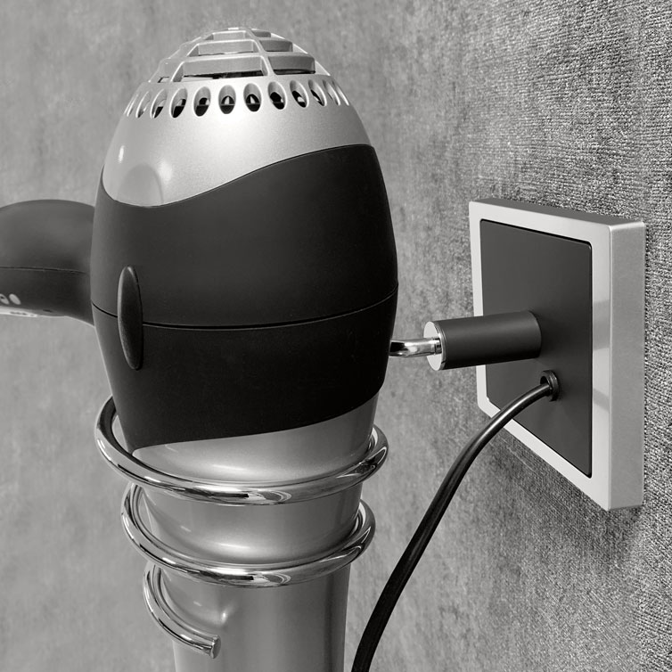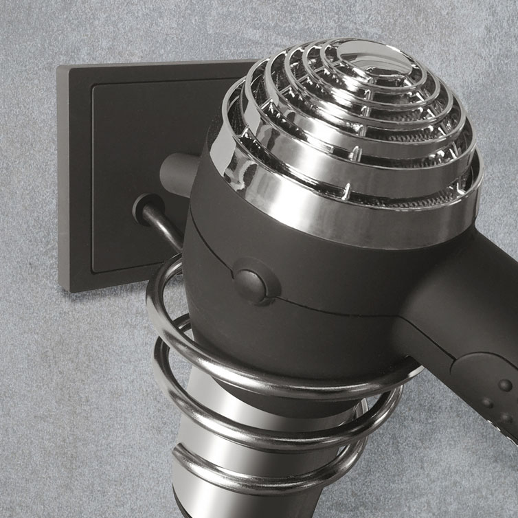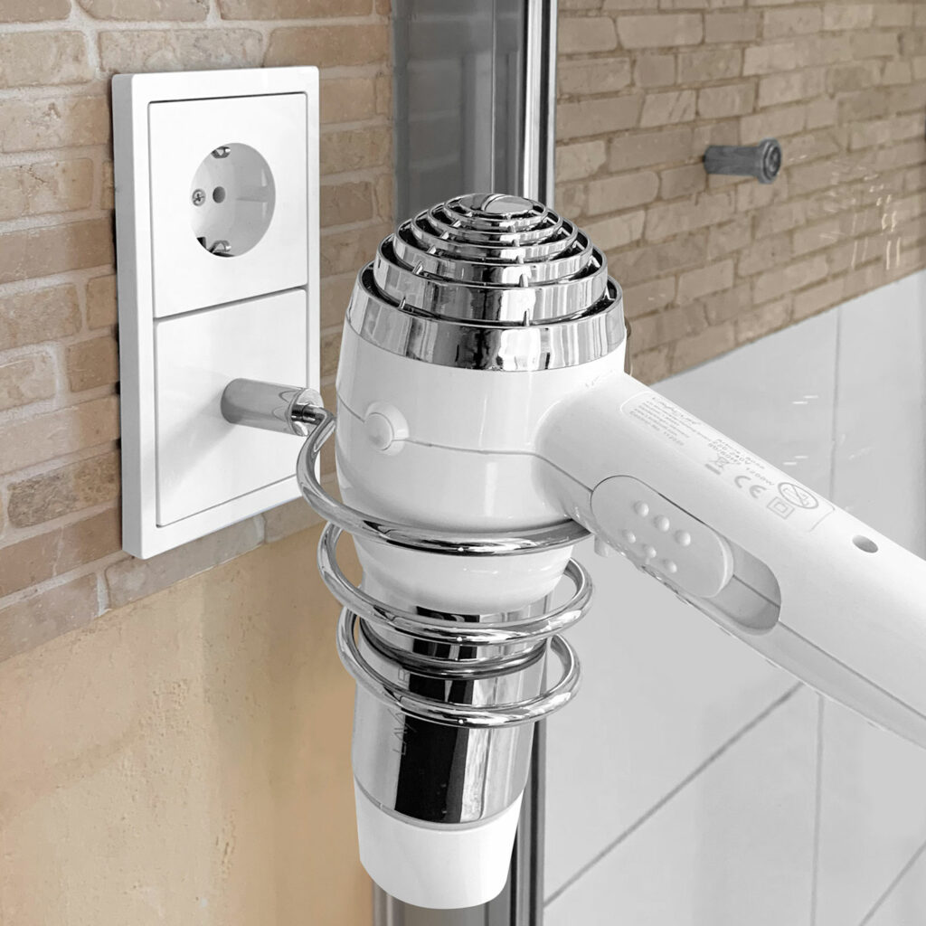 qles steht für die Verbindung von Funktion und Design – und beweist in Stylingfragen mit dem Föhnhalter Klasse. Der ebenso schicke wie praktische universelle Halter wird über die qles Flex-Base F auf dem Merten Schalterrahmen montiert. Die Stromzufuhr und die spiralförmige Ablage für den Föhn werden so kompakt verbunden.