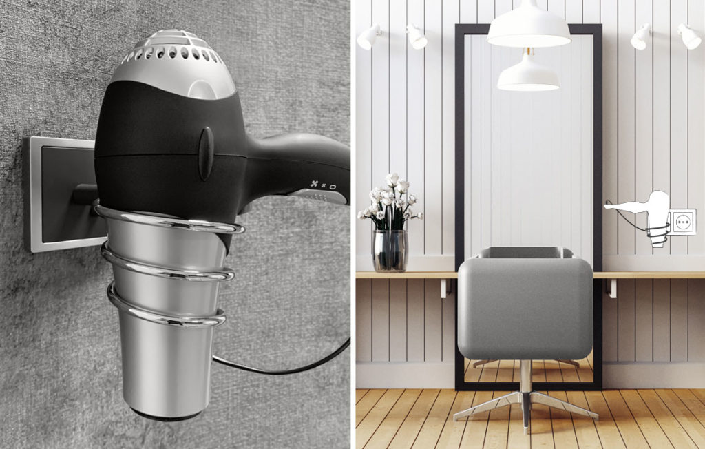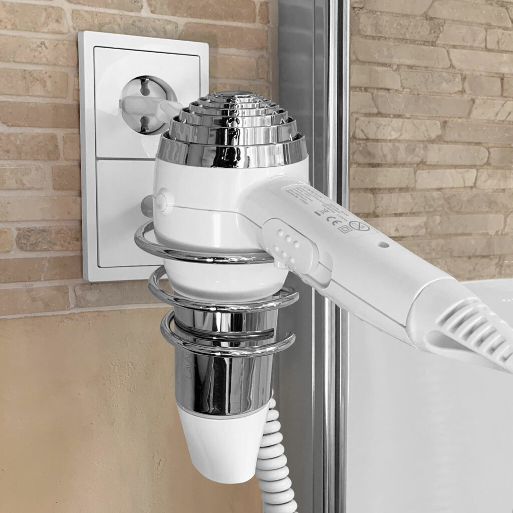 Für Innengestalter bietet der qles Föhnhalter damit eine edle Alternative zu den gängigen Haartrocknern, zum Beispiel in Hotels, Fitnessstudios, Wellnessbereichen oder Friseursalons. Auch im heimischen Badezimmer sorgt er stylisch für Halt. Für den Privatbereich ist der Föhnhalter ohne Stromzufuhr erhältlich, damit Ihr Kunde eine normale Steckdose nutzen kann.