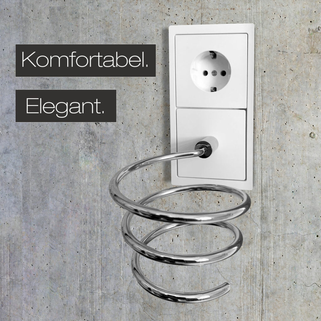 Der konisch geformte Spiral Föhnhalter hat im täglichen Gebrauch im Objektbereich gegenüber einem Ringform Föhnhalter einen großen Vorteil. In der Spiralform liegt der Föhn wie in einem Holster, durch die Form hat er etwas Bewegungsfreiheit und liegt aber trotzdem sicher darin. Bei abrupten oder unbeabsichtigten Bewegungen gegen den Föhn fängt der Halter die Bewegung und den Druck viel besser ab, als der starre Ring indem der Föhn fest drinnen steckt. Sie können den qles Föhnhalter mit allen gängigen Föhnmodellen kombinieren.