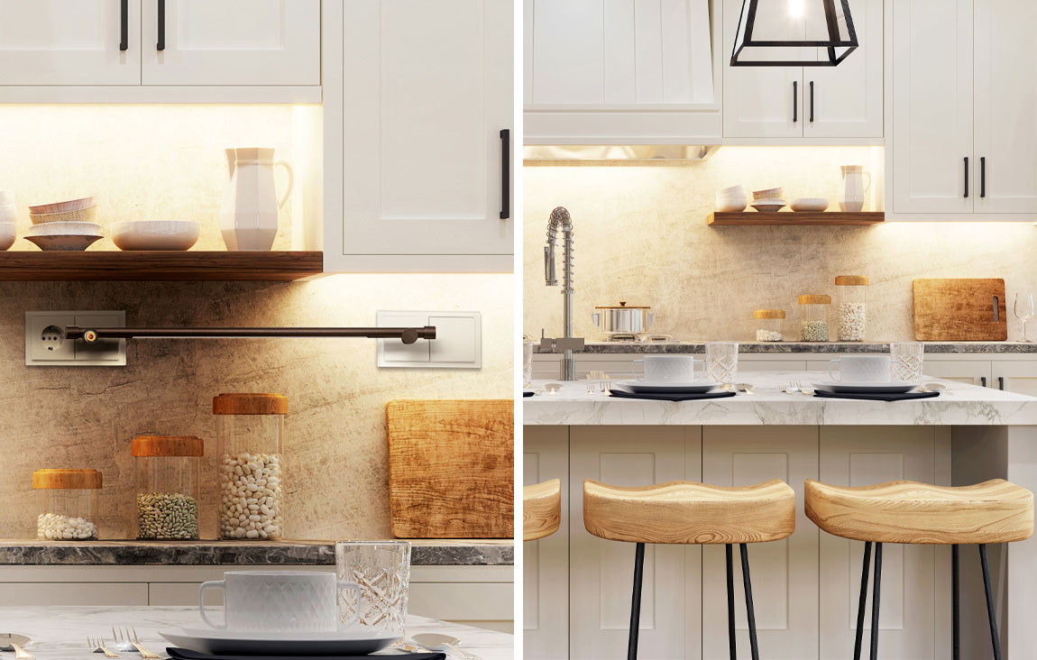 Verbinden Sie aufregendes Lichtdesign und praktische Halterungen jetzt einfach. Die beleuchtete qles Küchenstange und die qles Gardinenstange punkten durch warmweißes LED-Licht und massive Qualität.