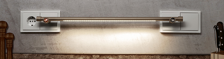 Verbinden Sie aufregendes Lichtdesign und praktische Halterungen jetzt einfach. Die beleuchtete qles Küchenstange und die qles Gardinenstange punkten durch warmweißes LED-Licht und massive Qualität.