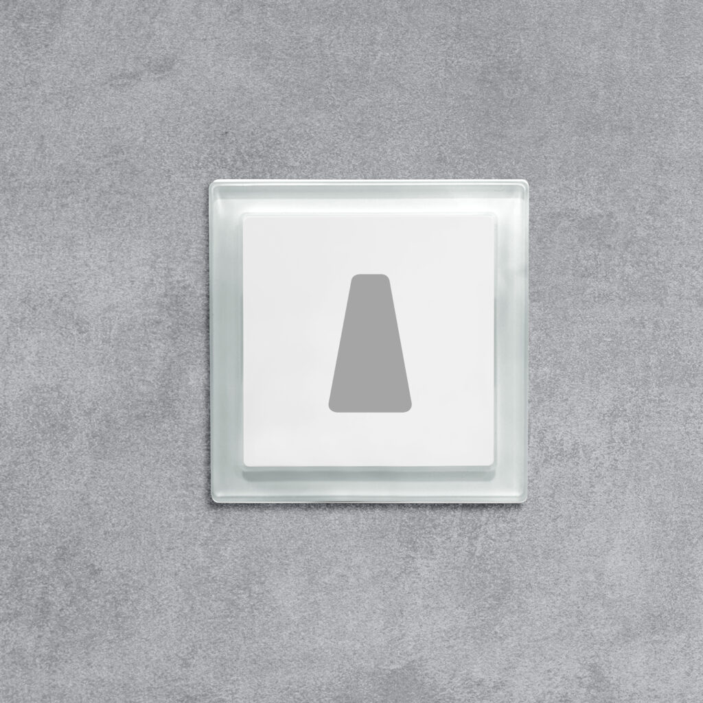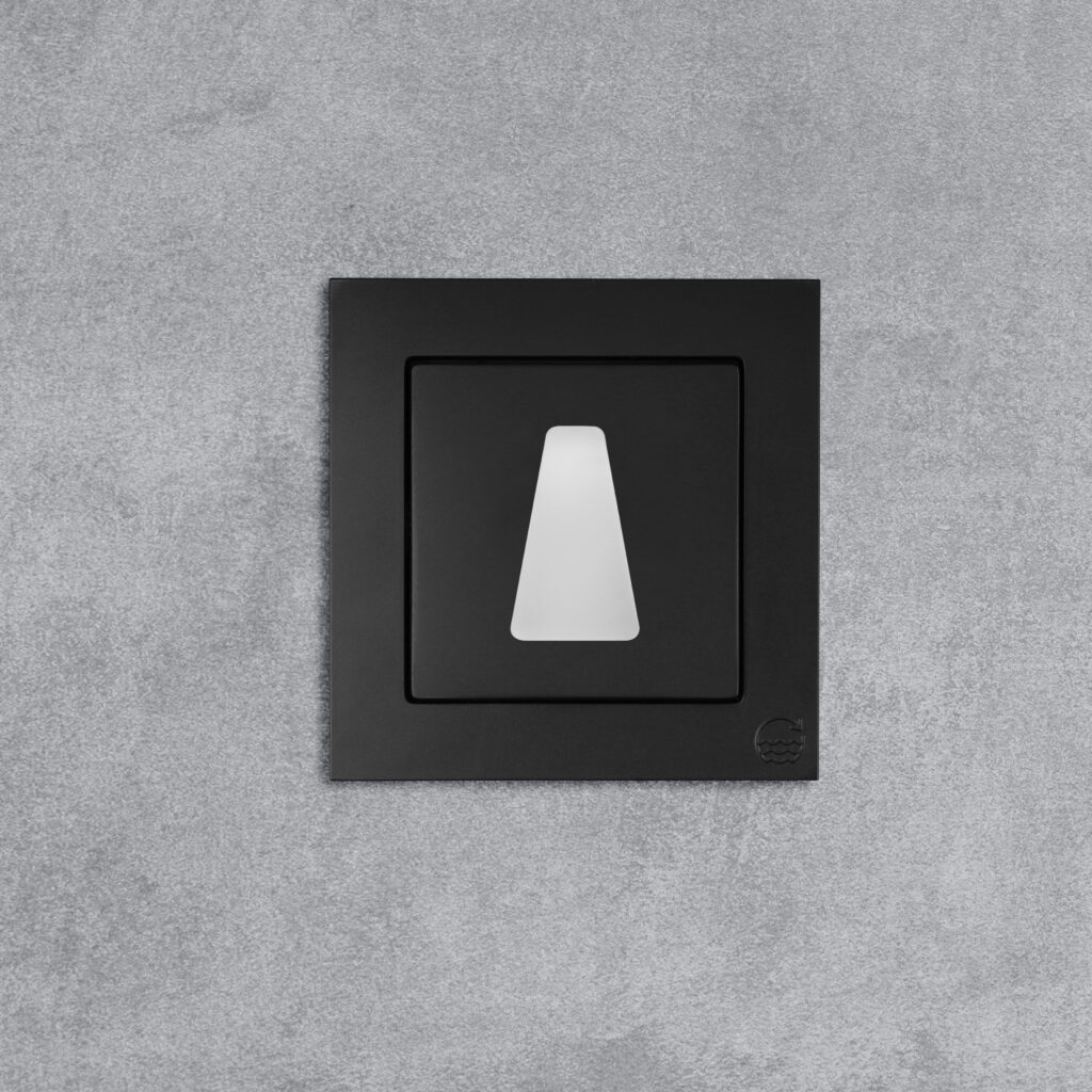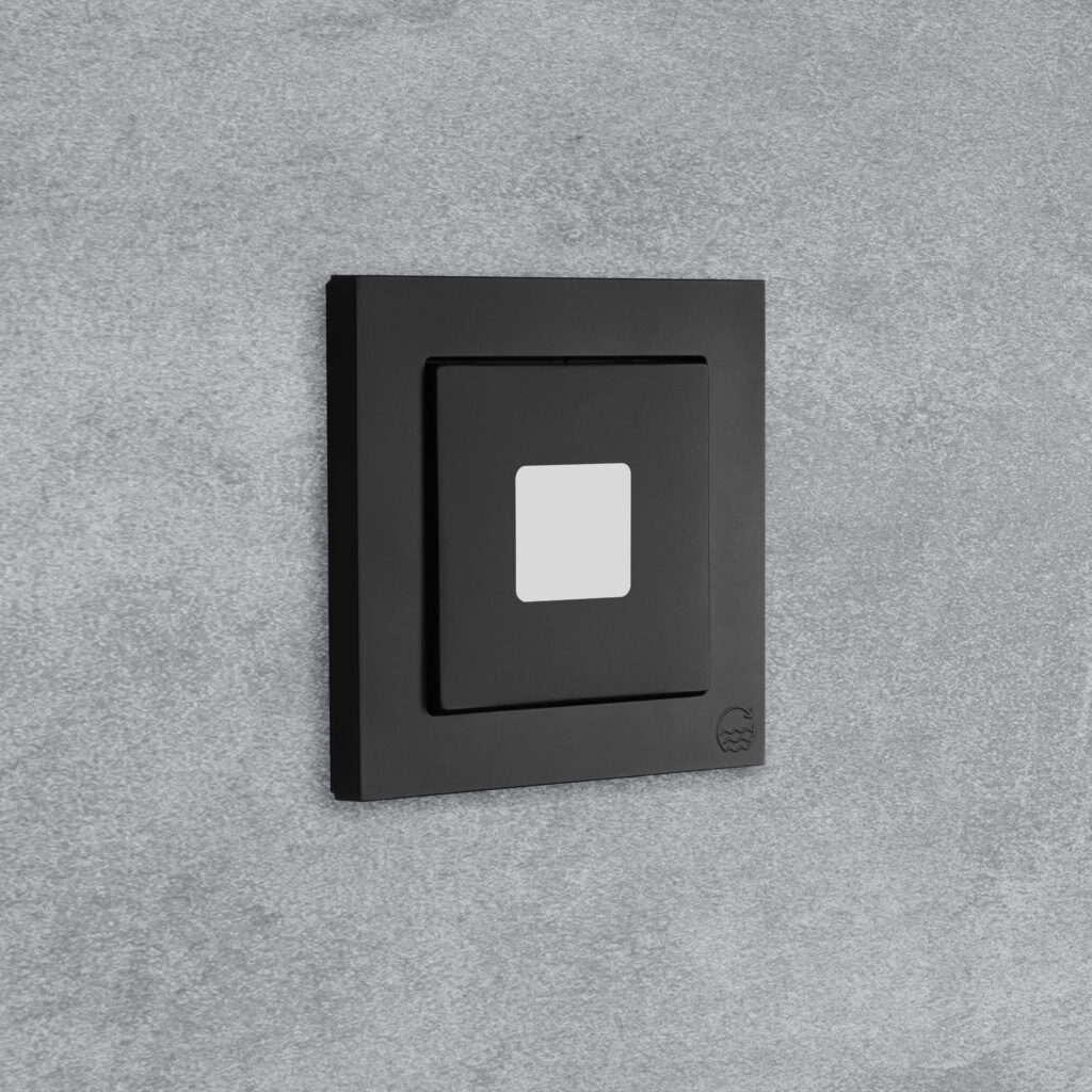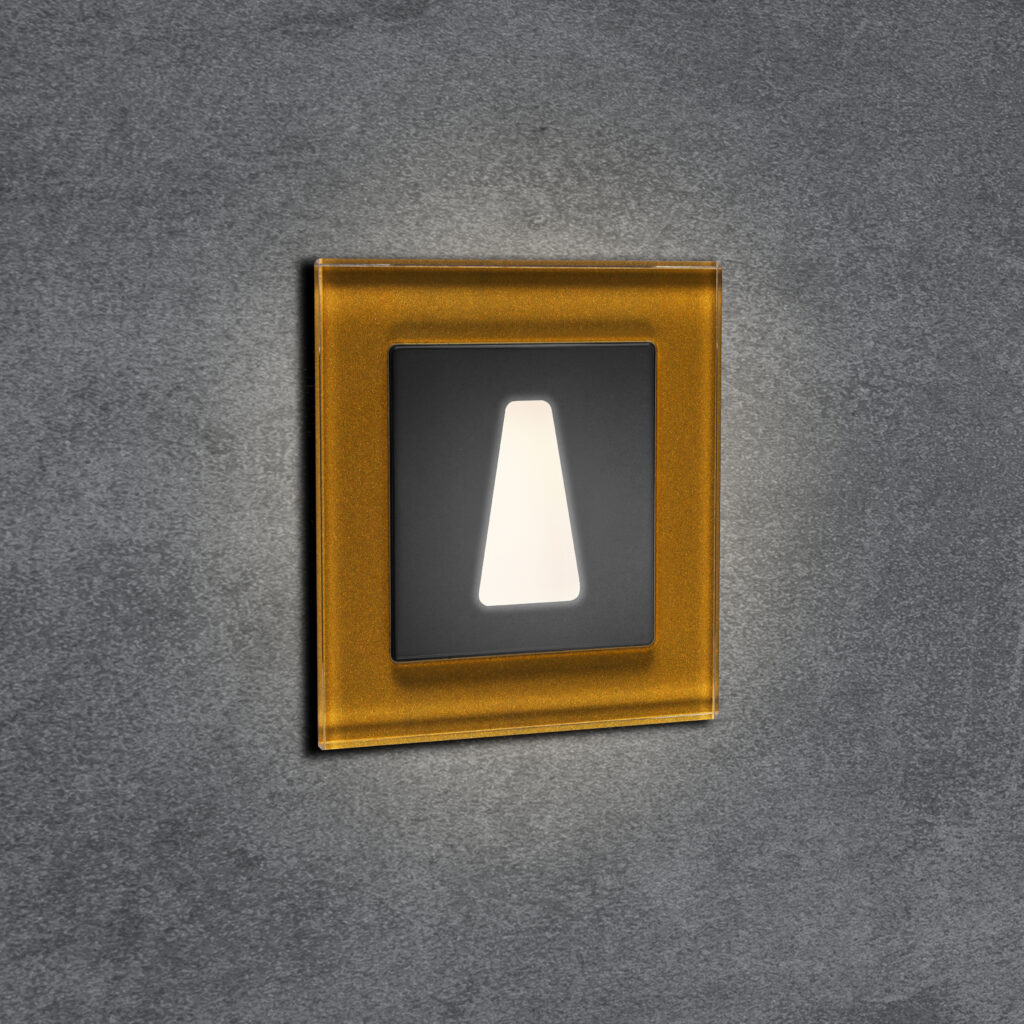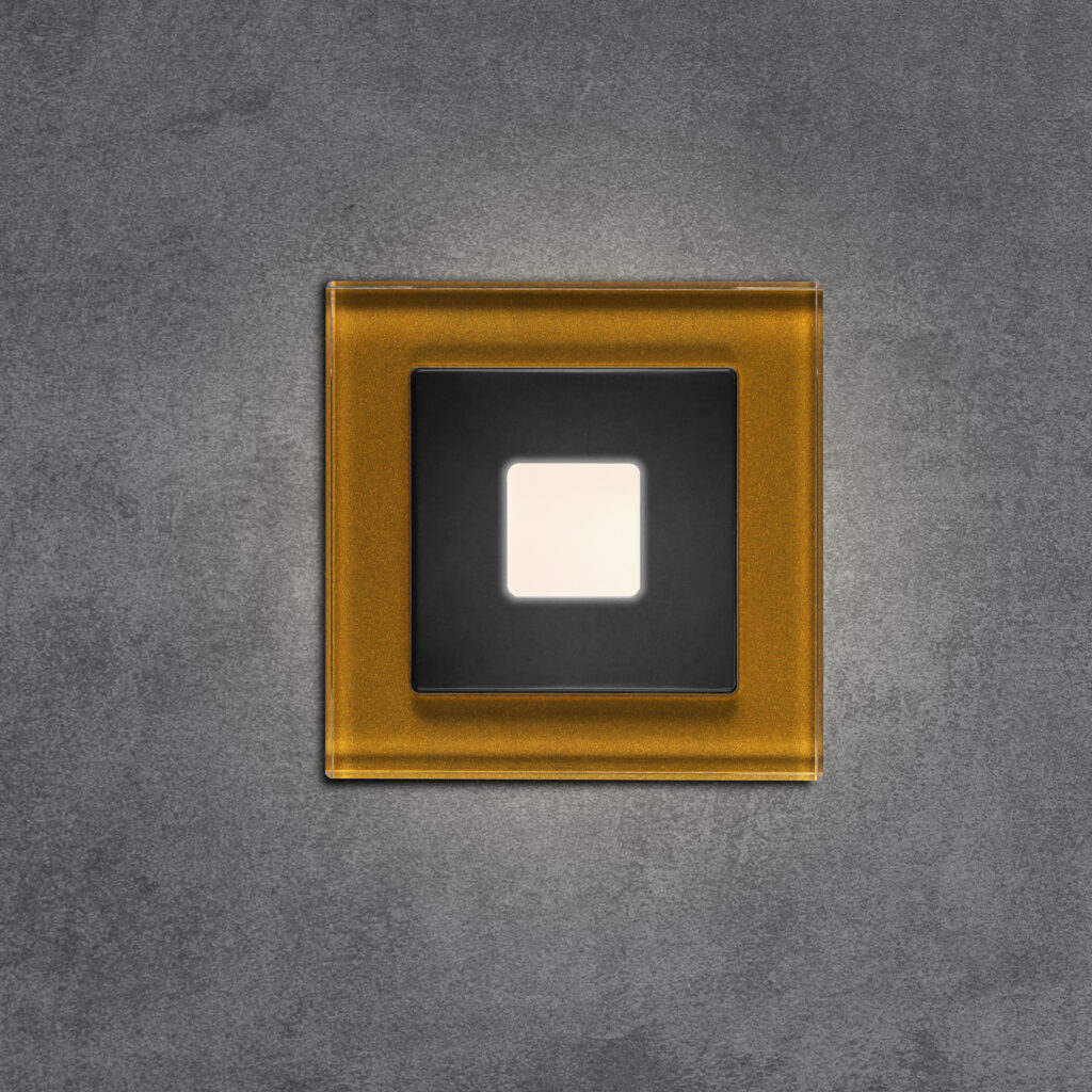 Merten M-PLAN Echtglasrahmen in Gold mit einem qles Treppenlicht Quadrat und Abdeckplatte in Anthrazit.
